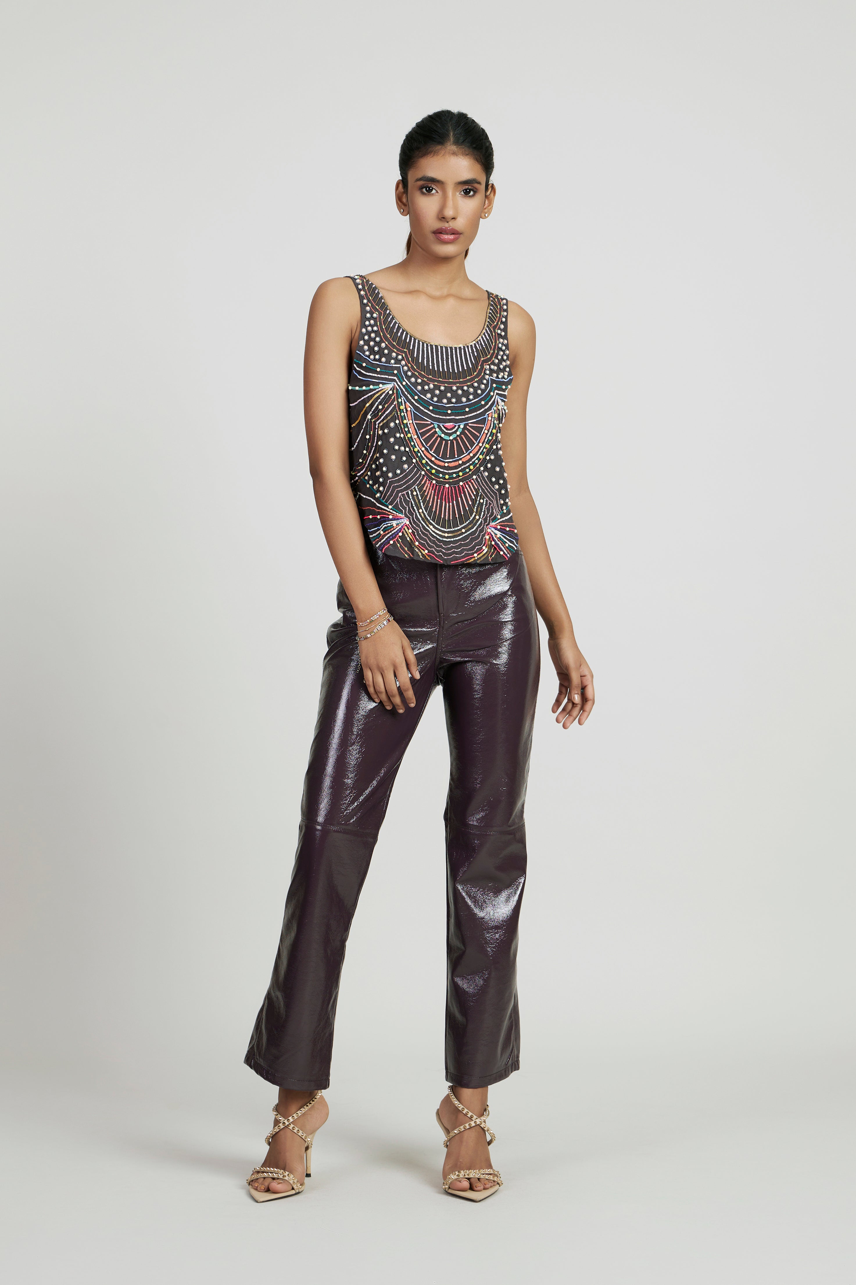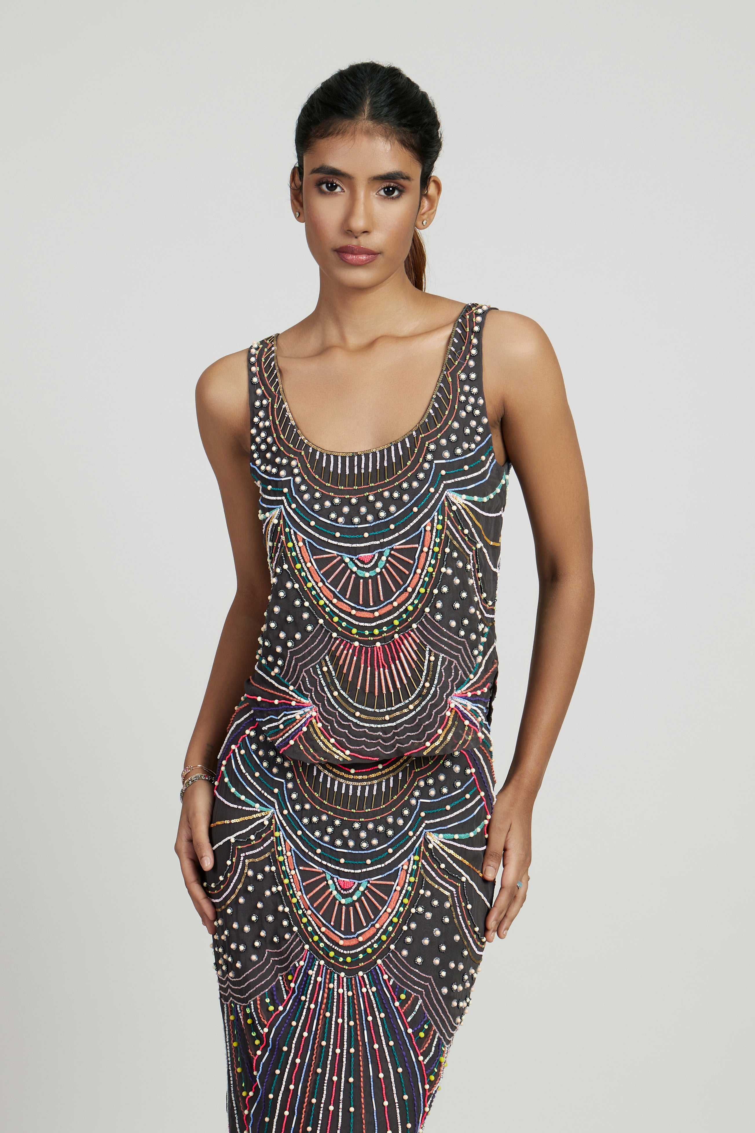 Hand-embellished with multicolored beads and threadwork, the sleeveless Jenny tank pairs perfectly with its matching Jenny skirt