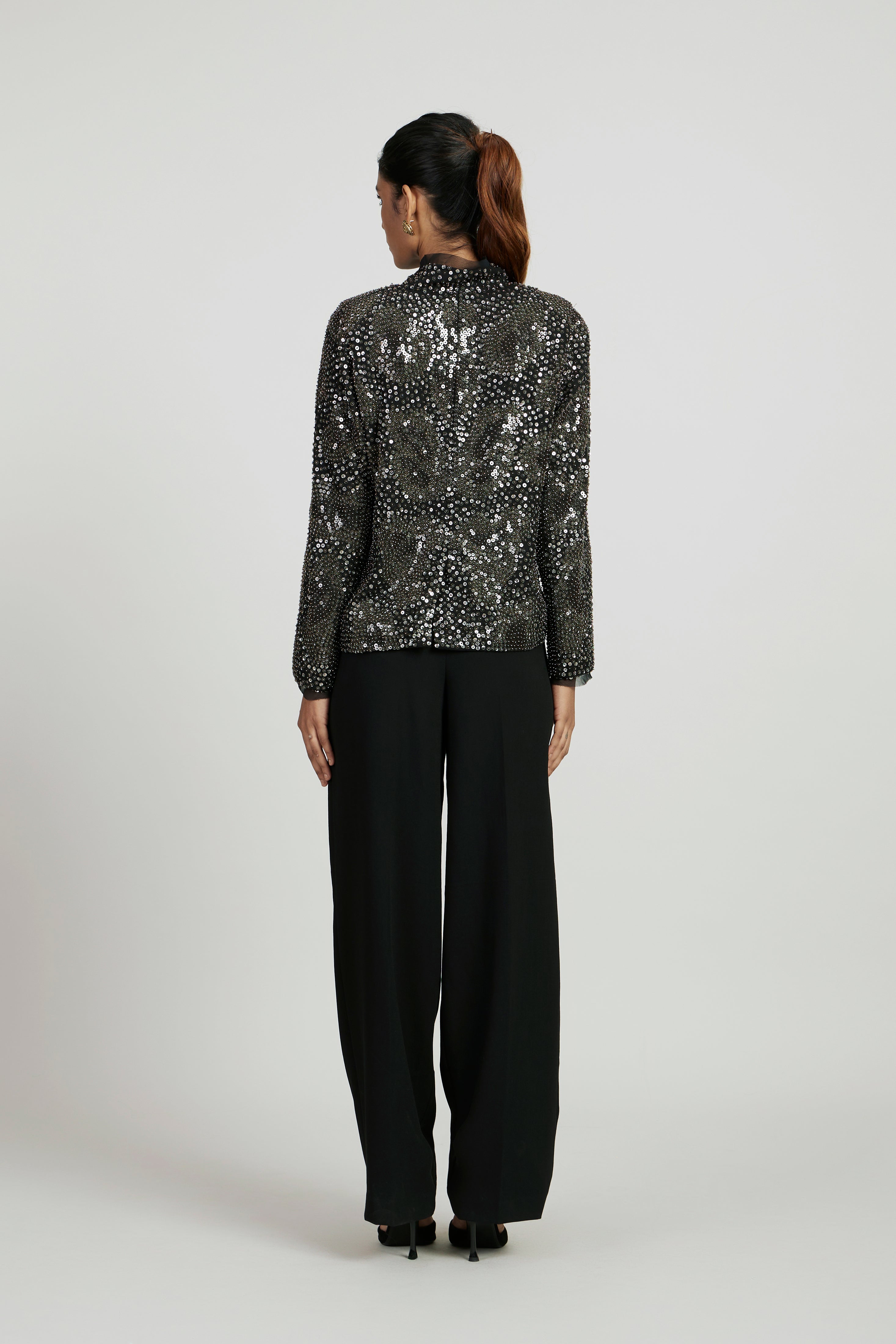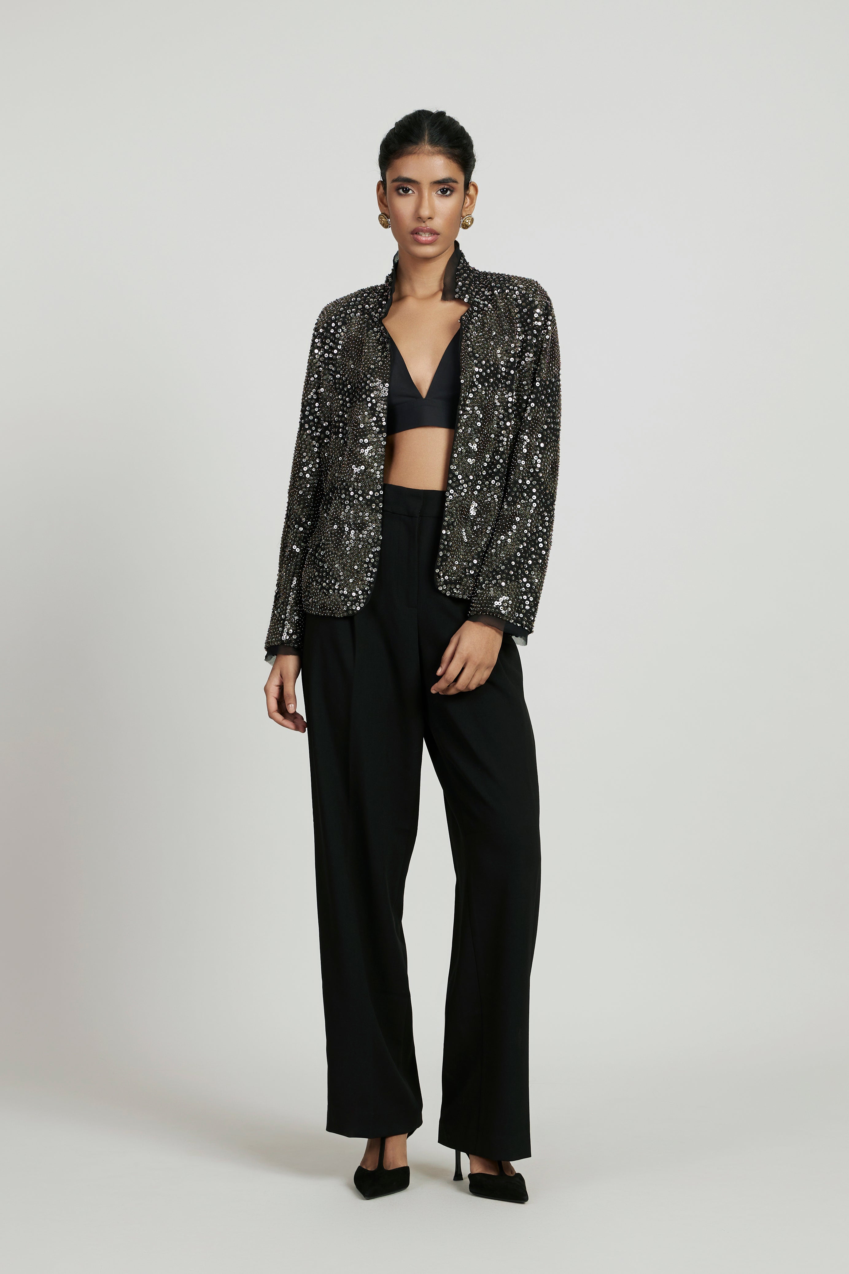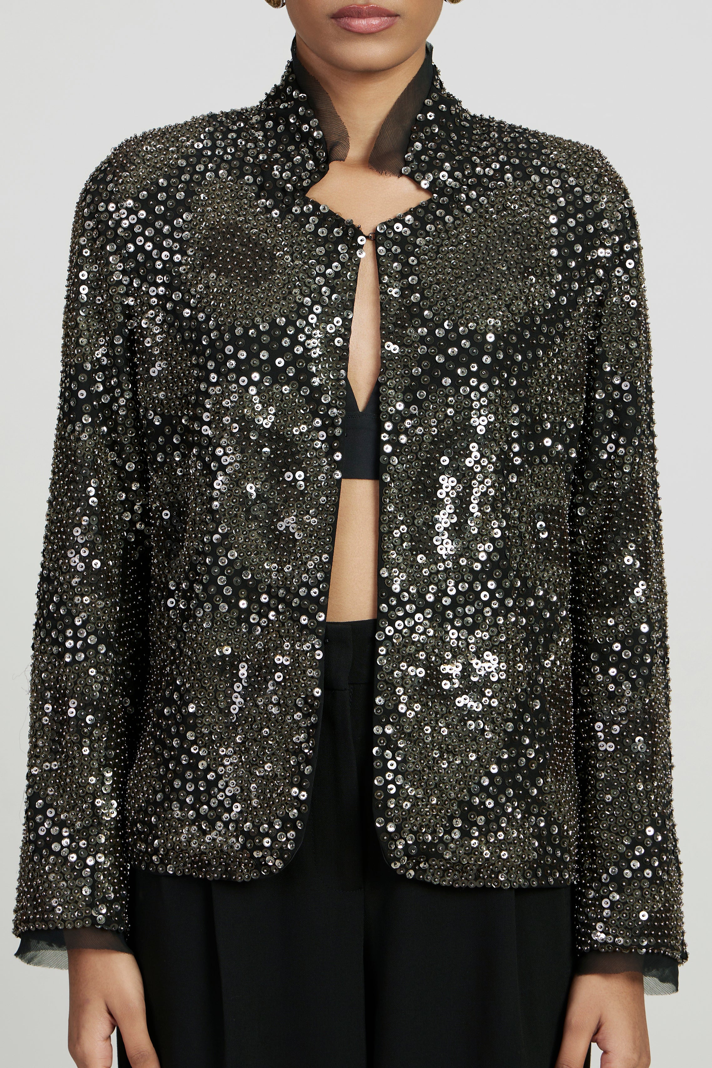 Black jacket, hand-embellished with pewter sequins and silver beads, featuring raw-edge detailing on the collar, full sleeves, and a double hook closure